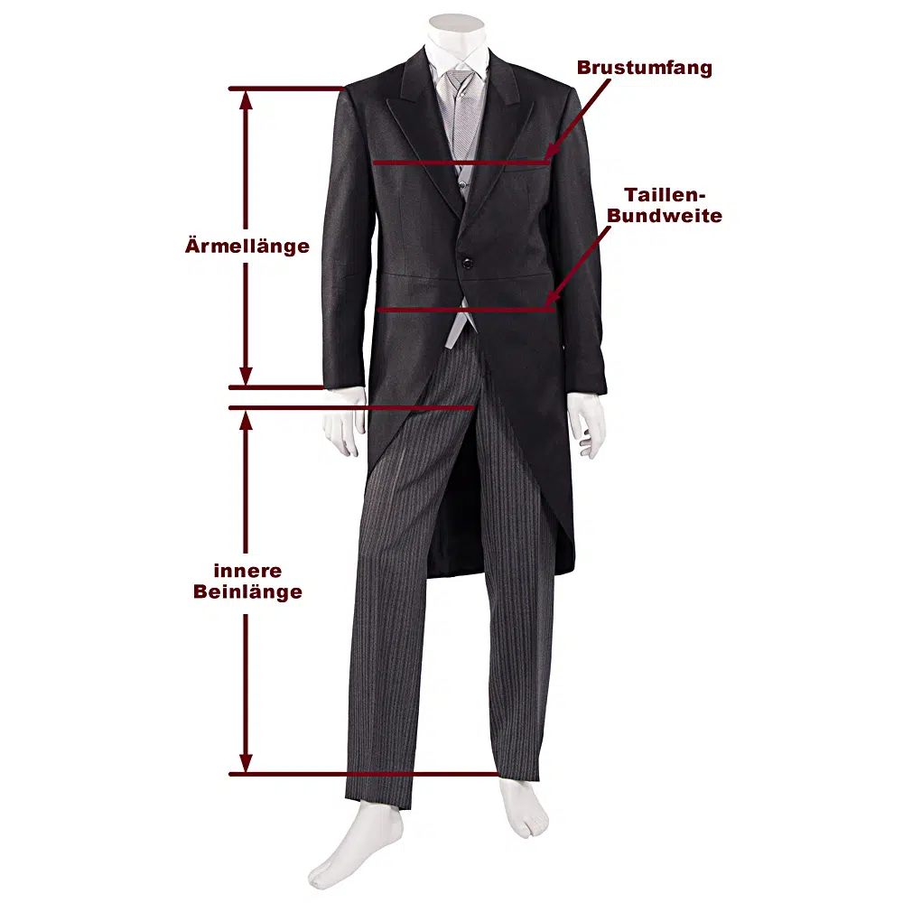 Leihgebühr für Cut-Sakko mit Weste und Hose in Topqualität inkl. Hemd, Plastron-Krawatte und Manschettenknöpfen. Die Anpassungen an Ihre Maße und die Putzerei nach Ihrer Leihe sind im Preis bereits enthalten. Auf Wunsch liefern wir Ihnen den Cut gegen einen Aufpreis zu jeder beliebigen Adresse innerhalb Wiens und holen ihn auch wieder ab. Der Preis bezieht sich auf eine Leihdauer von bis zu 3 Tagen oder über das Wochenende.